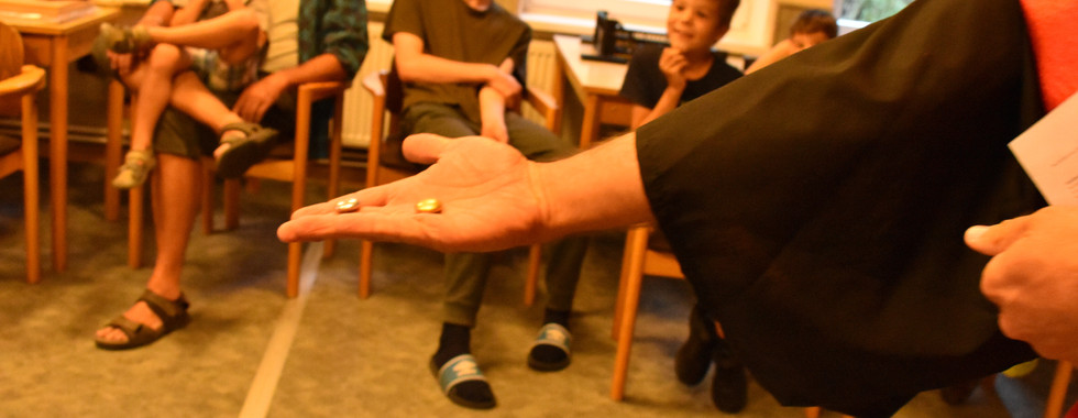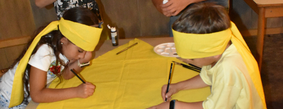 Soustředění je letos ve znamení starých japonských škol go. První úkol pro děti po rozdělení do týmů proto zněl: založit si školy nové. Školy jsou tři: Ramen, San-biki no kitsune no mure a Kyoshó no ishi (významy/překlady zkusíme přinést zítra). Všechny děti si poté musely zvolit svá japonská jména, udělat čelenky a vyrobit vlajku školy. Povedlo se.